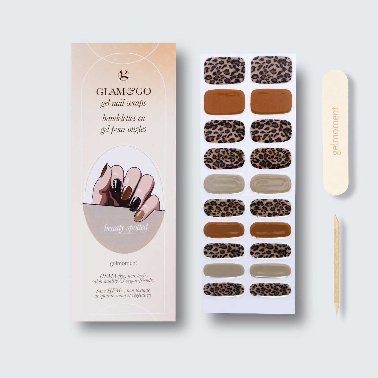 Plus, not only do GLAM & GO gel nail wraps provide the same glossy finish you know and love from our regular gel polish, but they are also HEMA FREE and have a wear time of up to 14+ days.